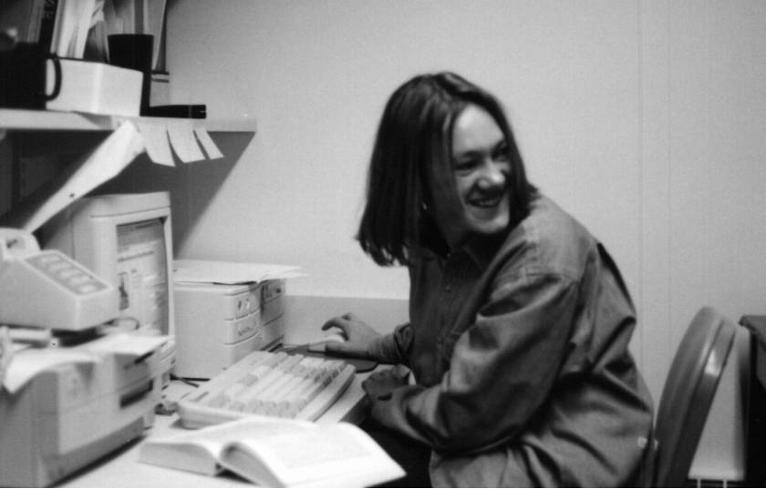 | Karin (looking at me sitting in the grass in front of Shatzel Hall)