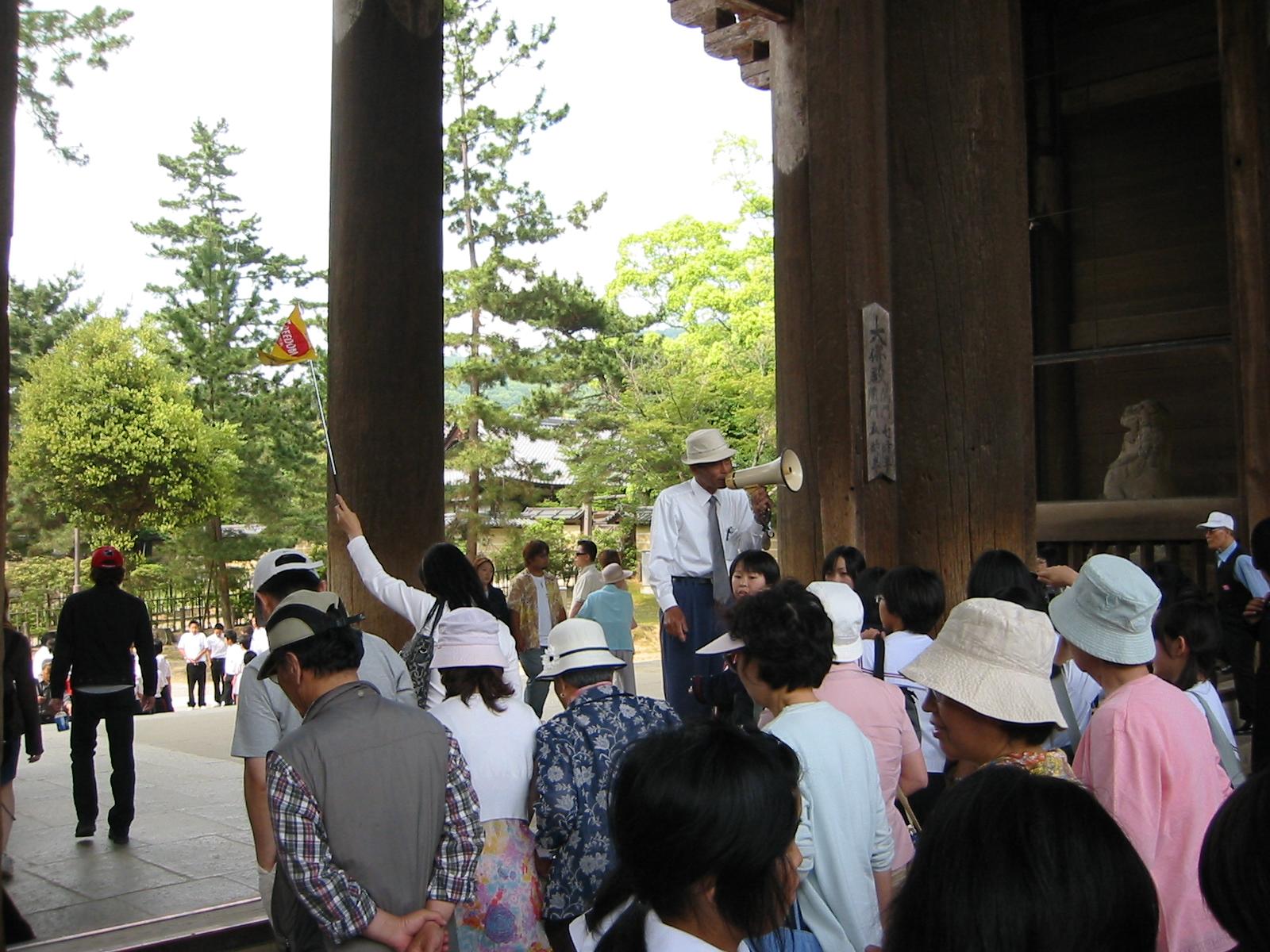 guide using megaphone to control tourist group